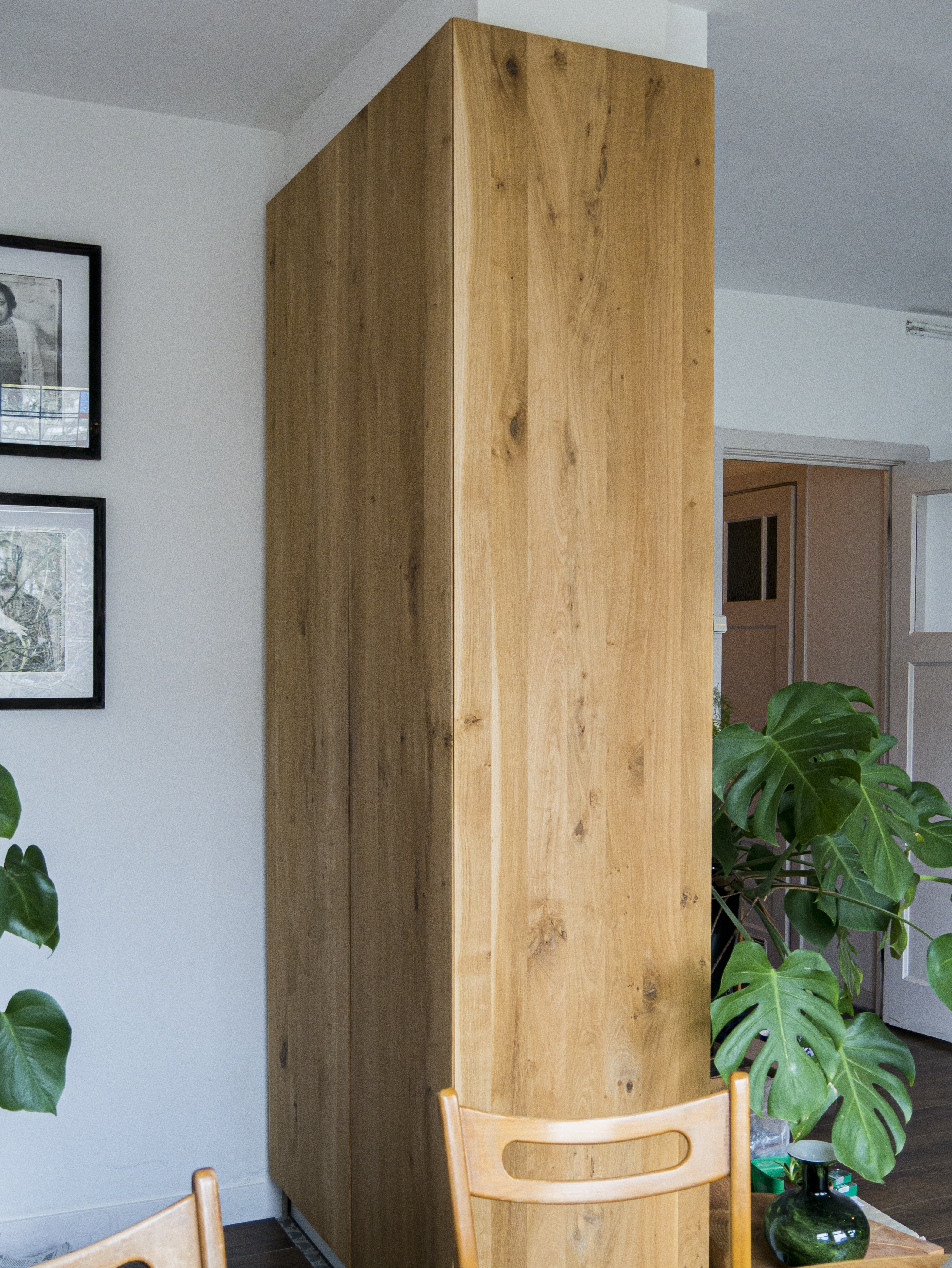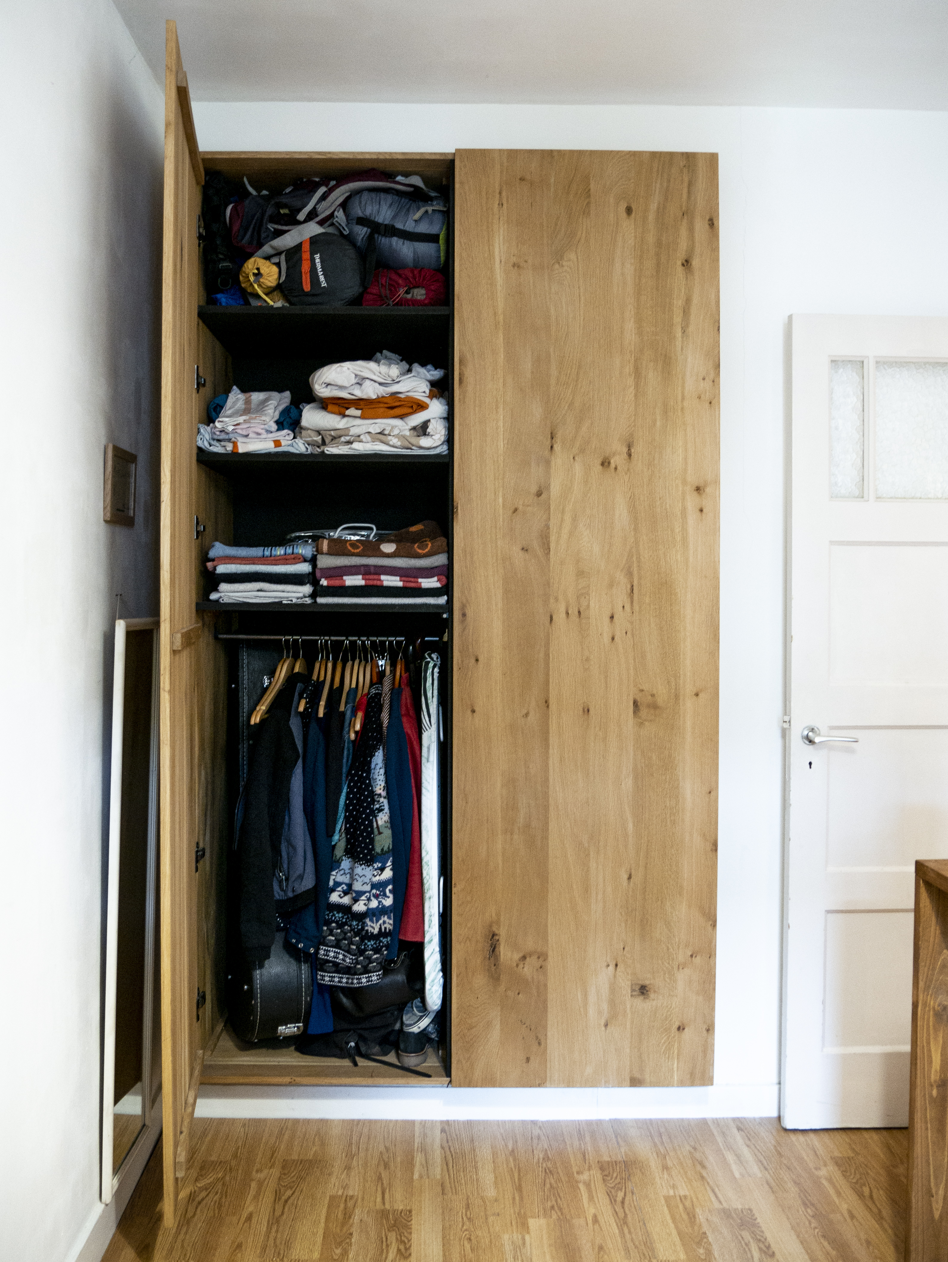 In de slaapkamer en woonkamer zijn op maat gemaakte opbergkasten geplaatst die als het ware uit de muur lijken te komen. Door de kasten 10 cm te laten uitsteken ontstaat een subtiel, ruimtelijk detail. Het geraamte is uitgevoerd in eikenhout, terwijl de binnenzijde is afgewerkt met zwart MDF. Zo ontstaat een strak en ingetogen geheel dat naadloos aansluit op de architectuur van het huis.