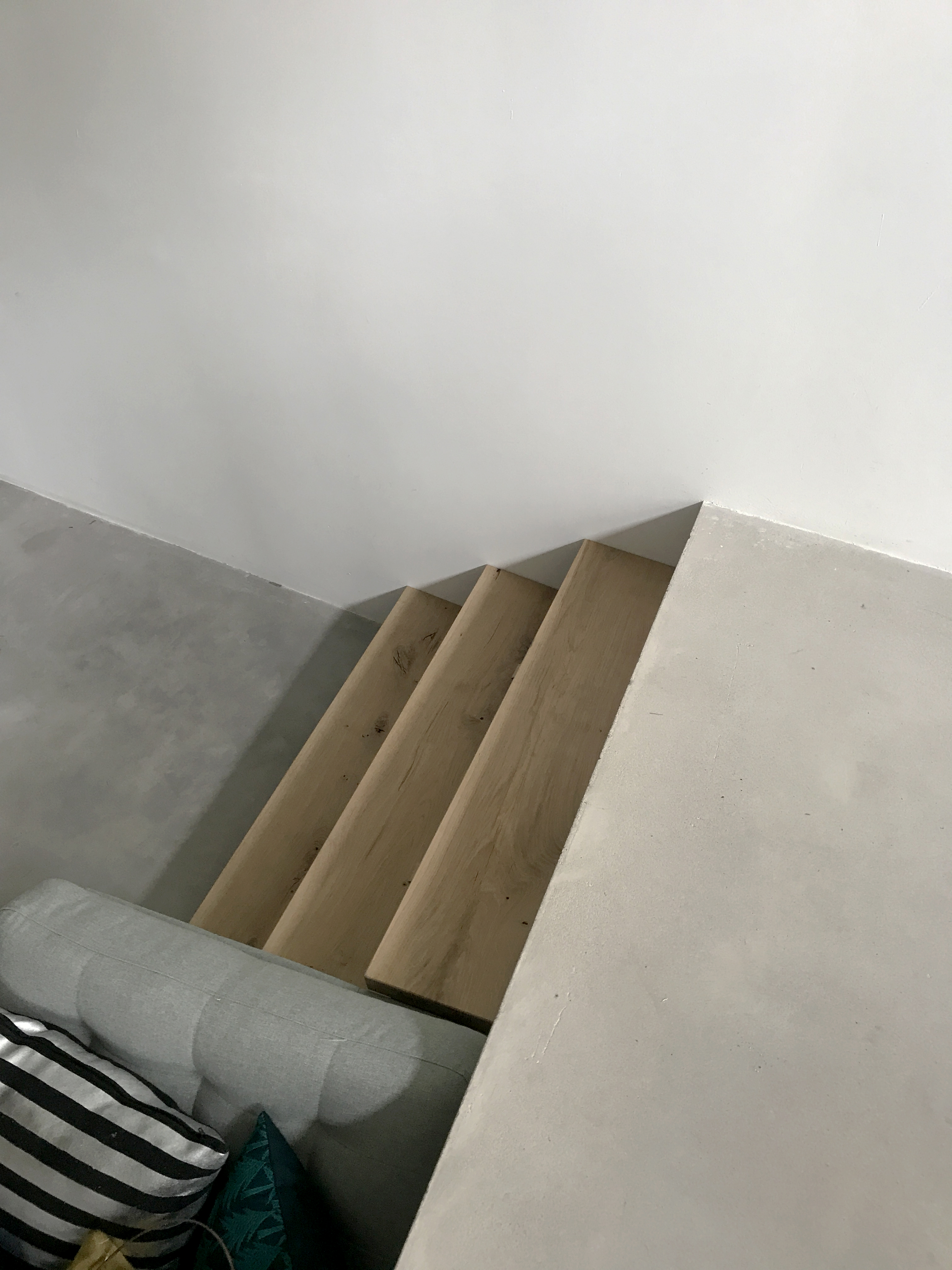 Geproduceert een eiken trapje om naar de zithoek te gaan in de woning. Op maat tussen de bank en de muren die niet parallel lopen van elkaar.
